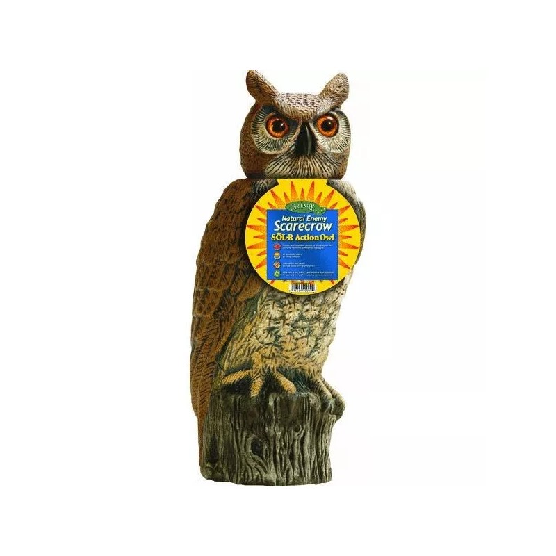 A new approach to chemical-free pest control. The solar owl protects lawns and gardens from pests with timed, solar-powered movement. Power is generated by solar cell with secondary power derived from the wind. Made from recycled materials, safe, and humane. No internal battery and no batteries need to be added. 18" tall.