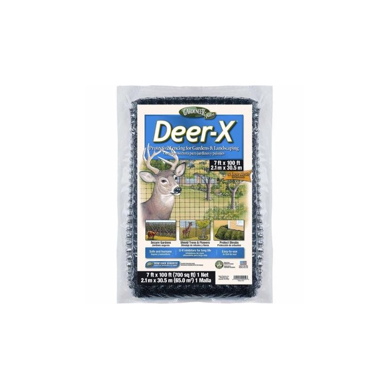 Keep pesky deer out of your gardens and landscaping with Gardeneer Deer-X Exclusion Net. This sturdy, 0.75" polypropylene mesh is ideal for creating temporary fencing and isolating your plant life from foraging animals. The 7 foot height makes creating an effective fence extremely easy. Just sink posts at regular intervals no more than fifteen feet apart, then secure Deer-X tautly along the length. Protect your vegetable gardens and shrubbery quickly and easily with Gardeneer Deer-X Exclusion Net. Made in the USA.