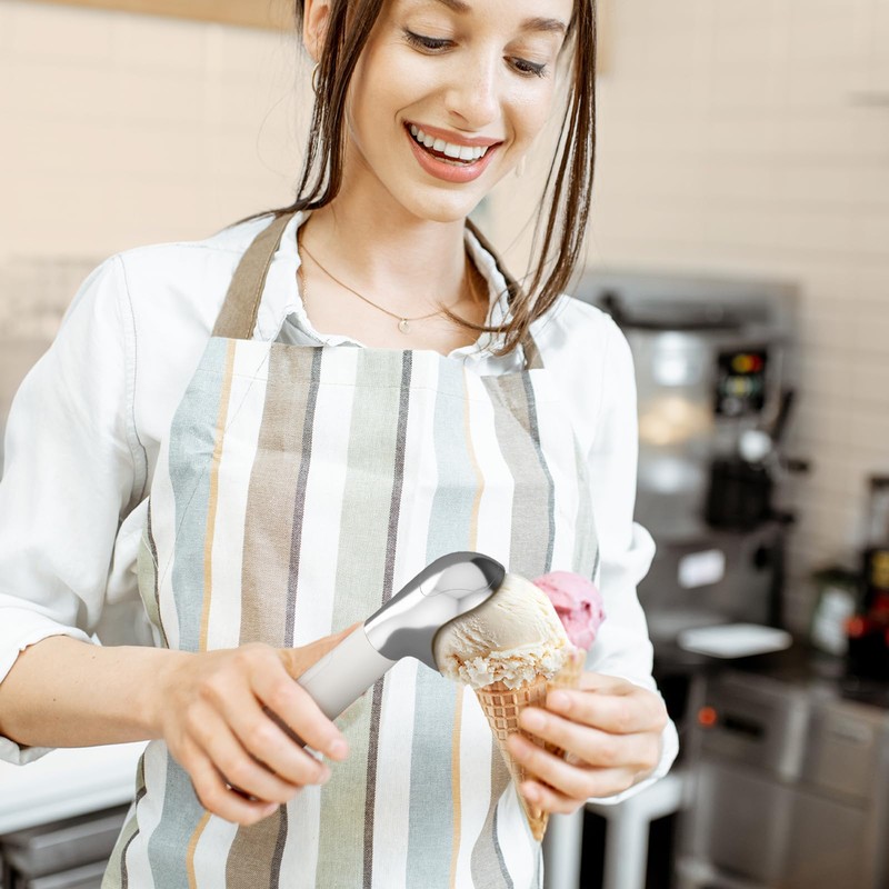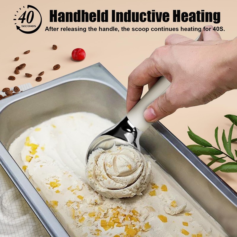 - 【Creative Heating Design】 This professional ice cream scoop features a grip sensor that activates the heating as soon as you lift it. It heats quickly to ensure smooth and even scooping every time. Avoid touching the scoop head when it reaches over 140°F to prevent burns. After use, let the scoop cool before placing it on wooden kitchen tools.