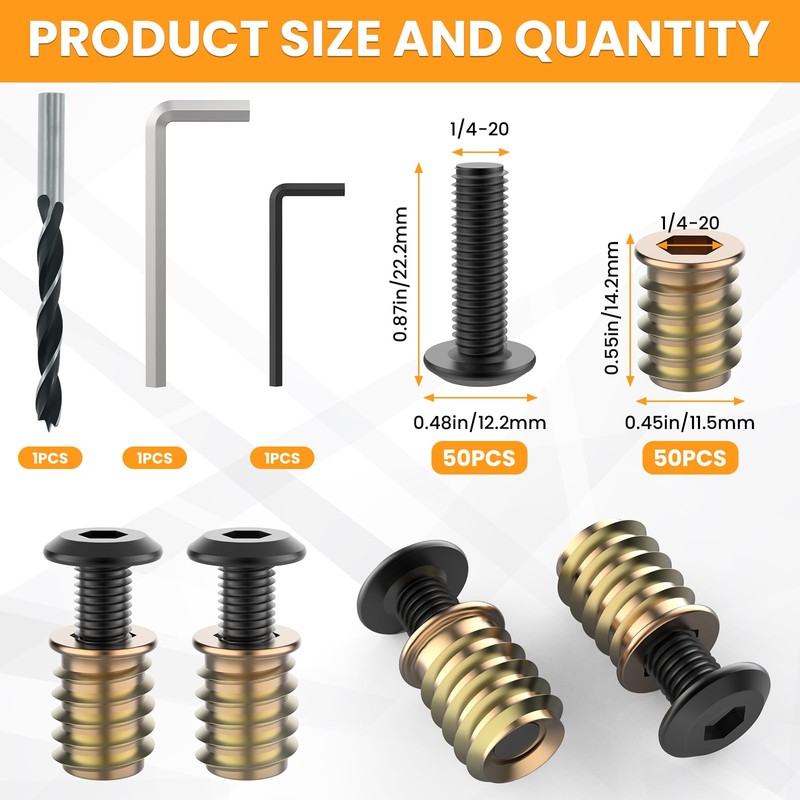 DALQUIS 50 Sets 1/4-20 x 19/32" Threaded Insert and Bolt for Wood, Hex Socket Drive Furniture Screw Nut Assortment Kits with Hex Wrenches and Drill Bit