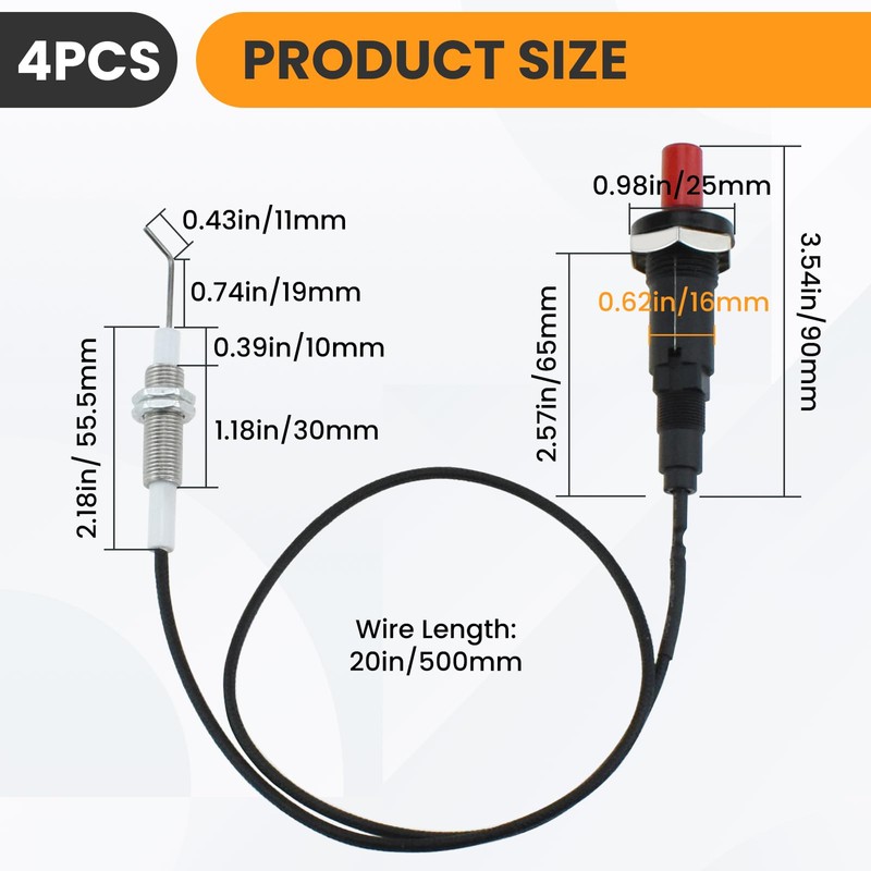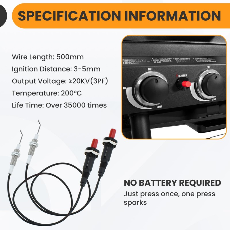- 𝐒𝐩𝐞𝐜𝐢𝐟𝐢𝐜𝐚𝐭𝐢𝐨𝐧𝐬: The piezo spark ignition wire length is 20 inches / 500mm, the ignition needle length is 1.97 inches / 50mm, and the ignition distance is approximately 5-6mm. The output voltage is >= 18KV, and it can withstand temperatures up to 200 degrees Celsius