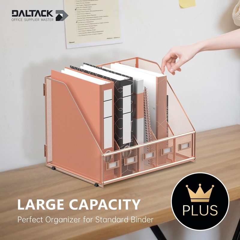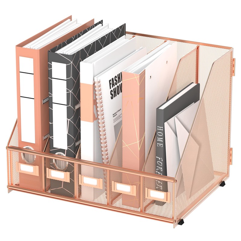 DALTACK Desk Organizers Magazine Binder Folder Holder with 5 Vertical Compartments File Organizer for Office Home School Organization, Metal Mesh, Rose Gold