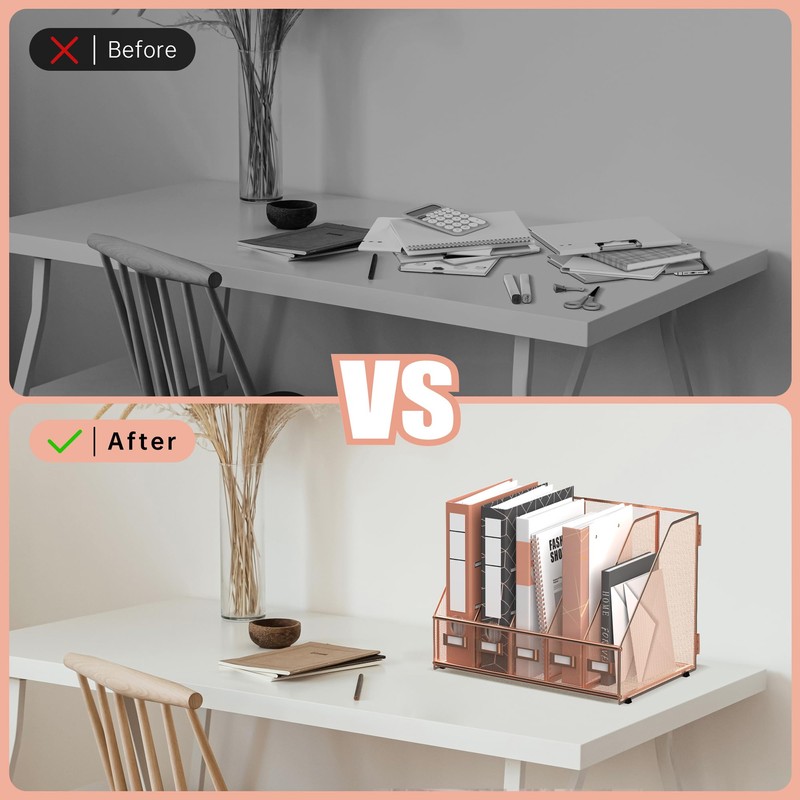 - Vertical Storage: Our binder holder for desk can help you organize your files vertically. This rose gold desk organizer just takes up a small area of the table but bring you a clean and ordered working or studying room.