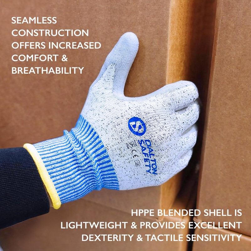 - WORK GLOVES: Seamless Knit HPPE Glove with polyurethane coated smooth grip on palm & fingers. The DS301 cut resistant gloves work great in combination with the Slice ceramic blades for an extra piece of added protection to the users hands.