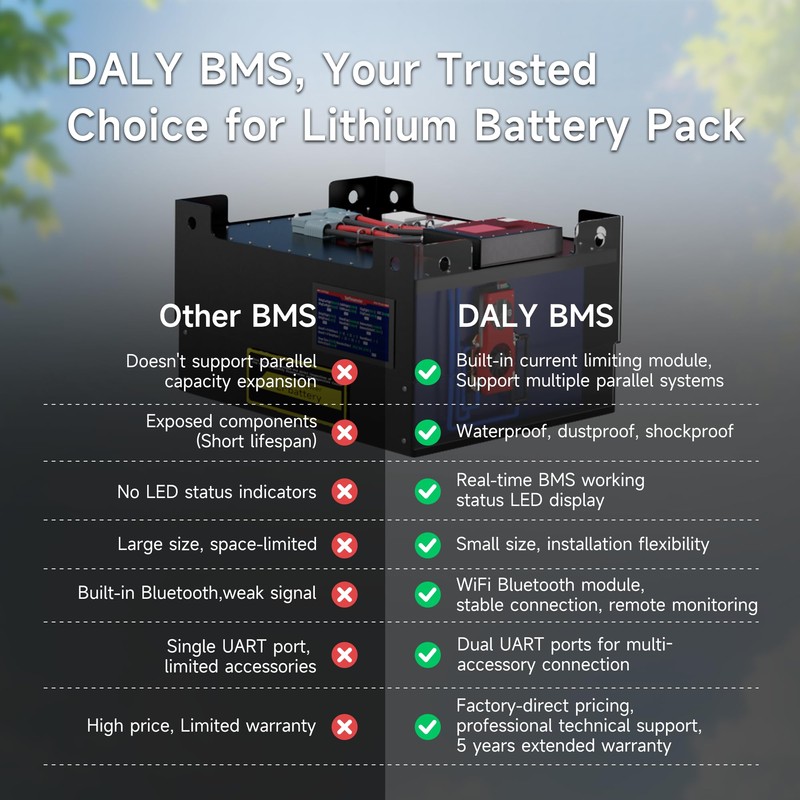 - SUPPORTS MULTIPLE PARALLEL SYSTEMS: The built-in parallel circuit of DALY BMS supports 8+ battery packs, letting you scale up capacity simply by adding more batteries - more power, longer runtime.