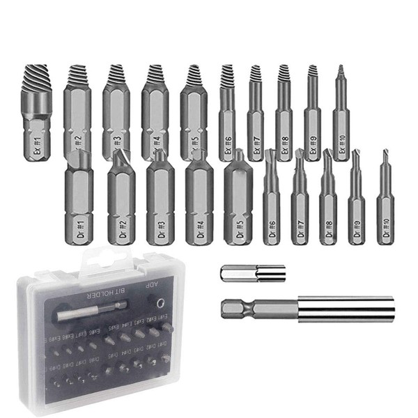 • 【22pcs Screw Extractor Set】: Include 10 pieces of drills (Dr#1, #2, #3, #4,#5, #6,#7,#8,#9,#10 )and 10 pieces extractor( Ex #1, #2, #3, #4,#5, #6,#7,#8,#9,#10).1 piece of extension bit holder and 1 piece of the socket adapter,suitable for general sizes and all kinds of broken bits to take out damaged screw or bolts.