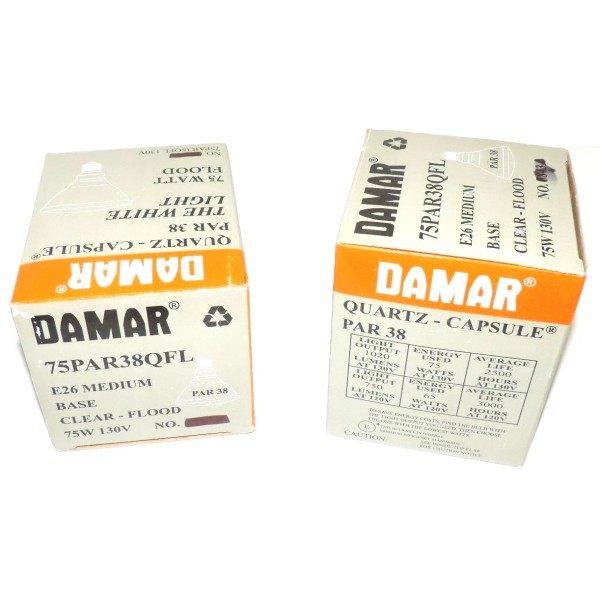 DAMAR LOT OF 2 NIB DAMAR 75PAR38QFL CLEAR FLOOD LIGHTS, E26 MEDIUM, 75 WATT, 130 VOLT