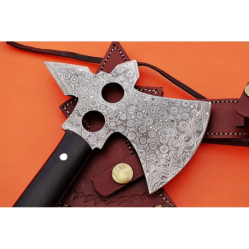Damascus Steel Cabin Axe, 12 Inches Long Hand Forged rain Drop Pattern Damascus Steel Axe Head, Black Scale Handle with 2 Inserting lace Hole, Bearded Hiking Battle Axe, Thick Cow Hide Leather Sheath