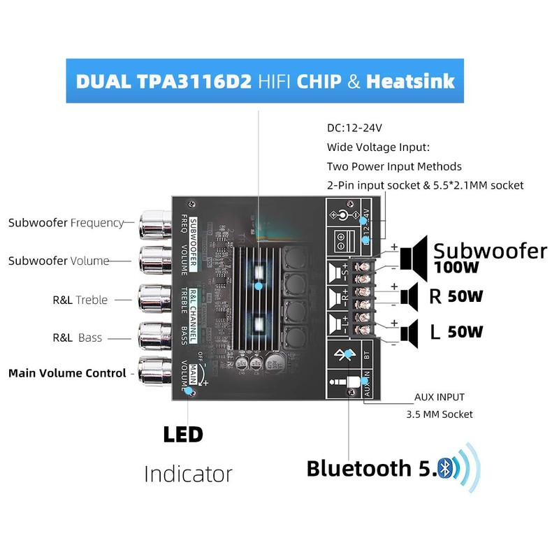 - TPA3116D2 HIFI Chip Solution: Stereo Dual-channel Output to Ensure Continuous Serial High-power Operation, THD ≤0.1%. Wide Voltage Input DC: 12-24V;