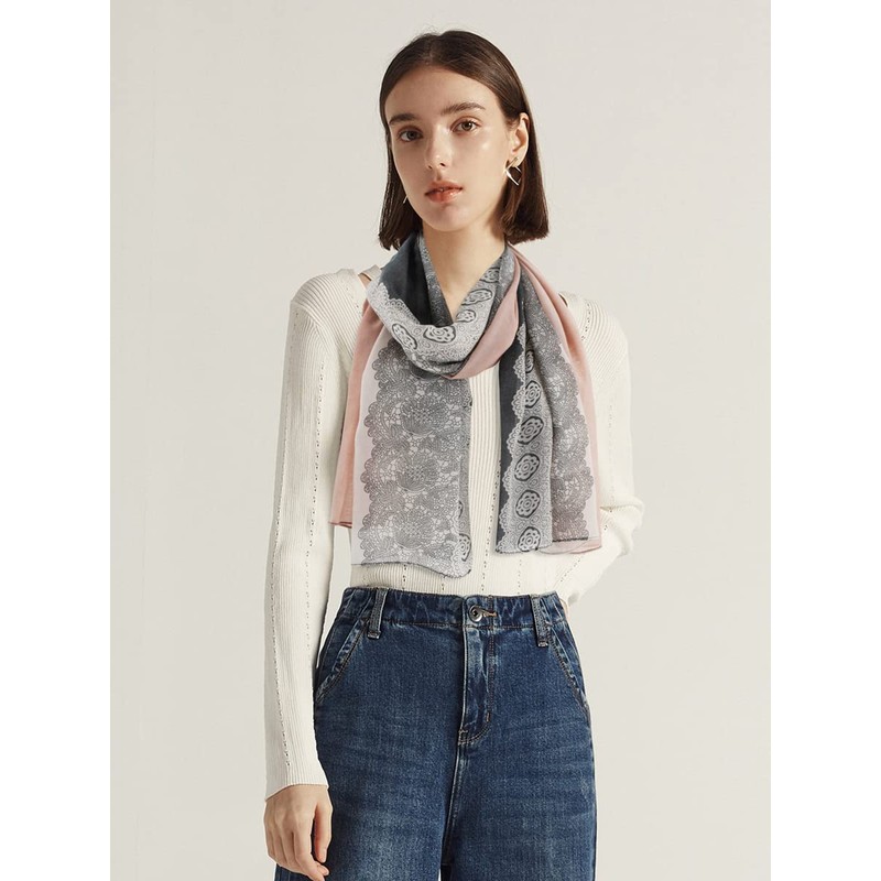 DAMILY Scarves and Scarves for Women with Lace Pattern, Beautiful Soft Scarf and Muslin Scarf for Women, Long Cotton Festive Stole, Grey/pink