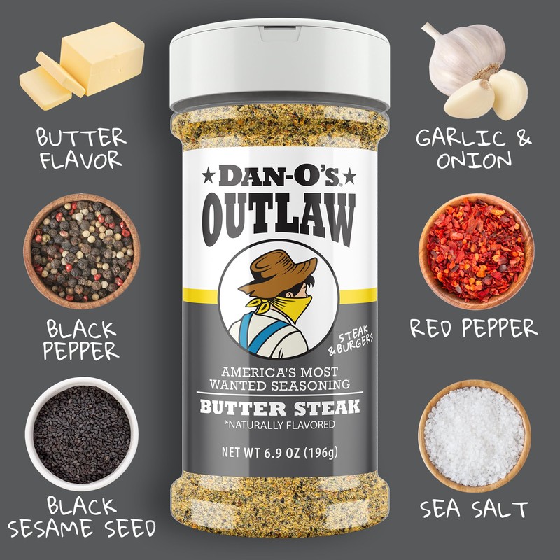 - BUTTERY SEASONING: Crafted to bring the rich, savory taste of butter to your favorite foods – without the melt, mess, or guilt – Dan-O’s Outlaws Butter Steak Seasoning is a bold seasoning that’s crafted for steak but good on Dan near anything.
