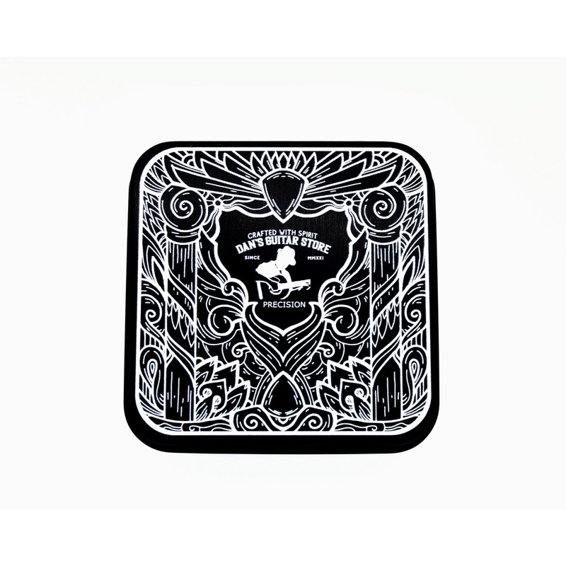 - [1x Pick Tin] 7cm x 7cm x 2.3cm Pocket sized, featuring artwork by Material Darkness and Dan's Guitar Store