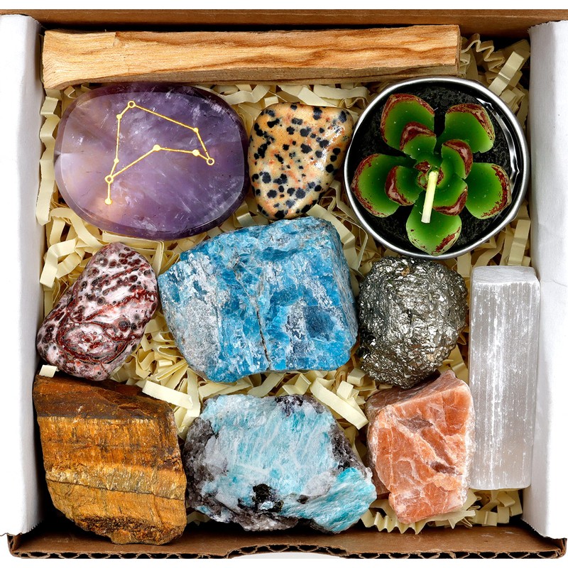DANCING BEAR Capricorn Zodiac Healing Crystals Gift Set (14 Pc): 9 Stones, 18K Gold-plated Constellation Necklace, Meteorite, Succulent Candle, Palo Santo Smudge stick, and Info Guide, Made in the USA