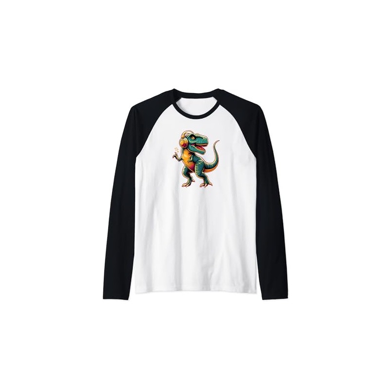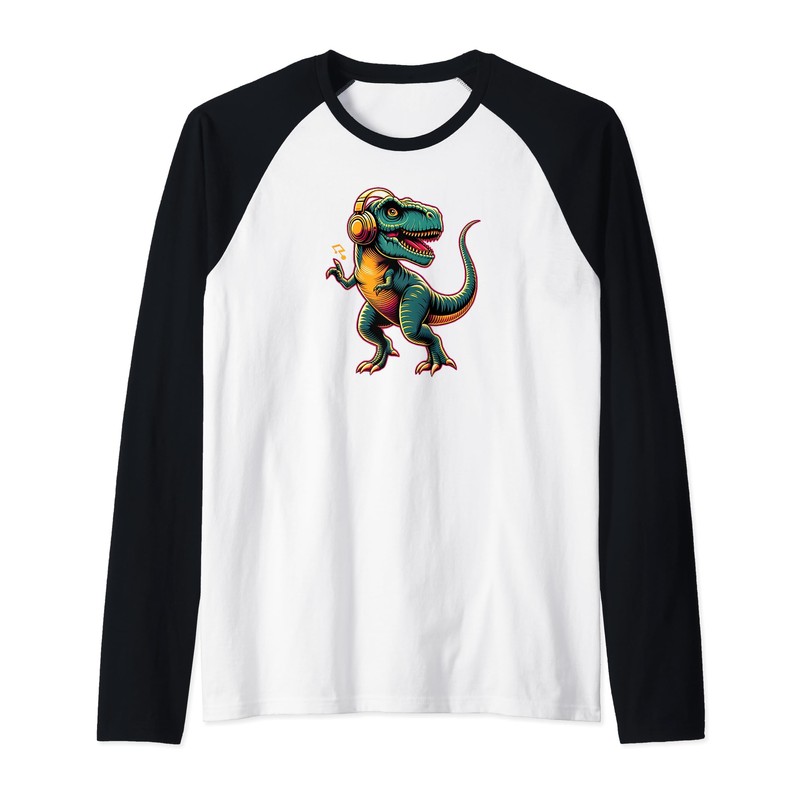 Dancing Tyrannosaurus Rex with Headphone Raglan Baseball Tee