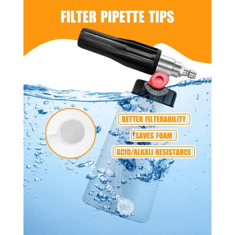 [Thick and Clinging Foam] Our advanced foaming technology of the pressure washer foam cannon delivers rich, dense foam that clings to surfaces, effectively loosening dirt and grime while minimizing the need for scrubbing, 1.25mm orifice included