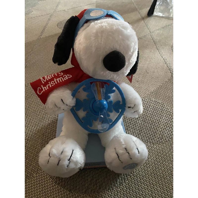 Push Snoopy’s foot and the peanuts theme song plays and the propeller on Snoopy’s chest spins and lights up, spelling Merry Christmas, Happy Holidays, and Here Comes Snoopy. Comes from a smoke free, Pet free home.
