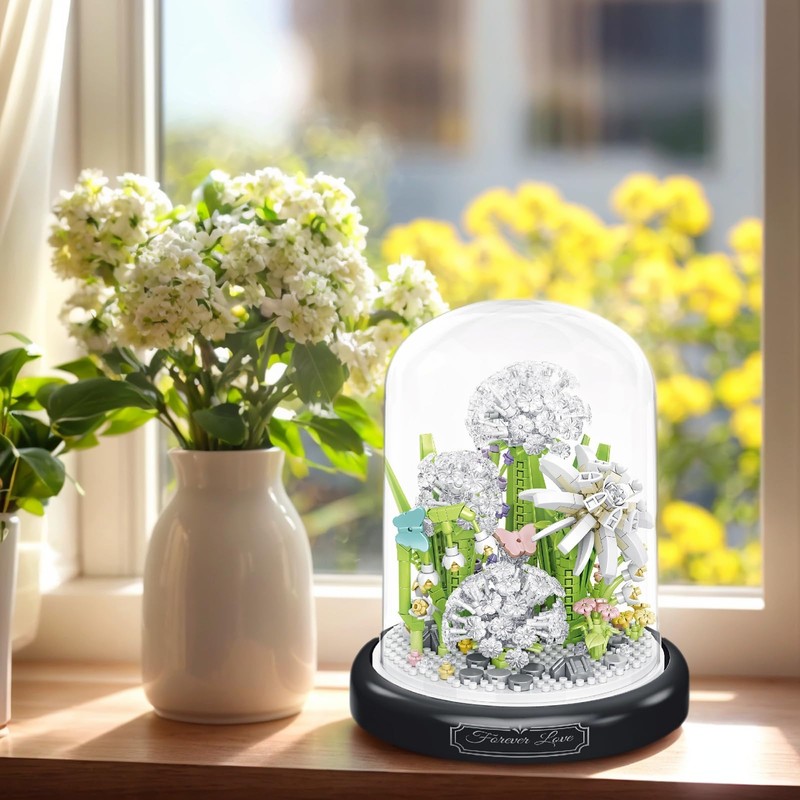 - CREATIVE HOME DECORATION: This flower building blocks includes a display base plate and dust cover. The never wilt or faded dandelion building toy can be placed in every corner of the room as a home decor, no vases and watering required, The Display Case with a dust cover can effectively protect the work and keep it bright at all times
