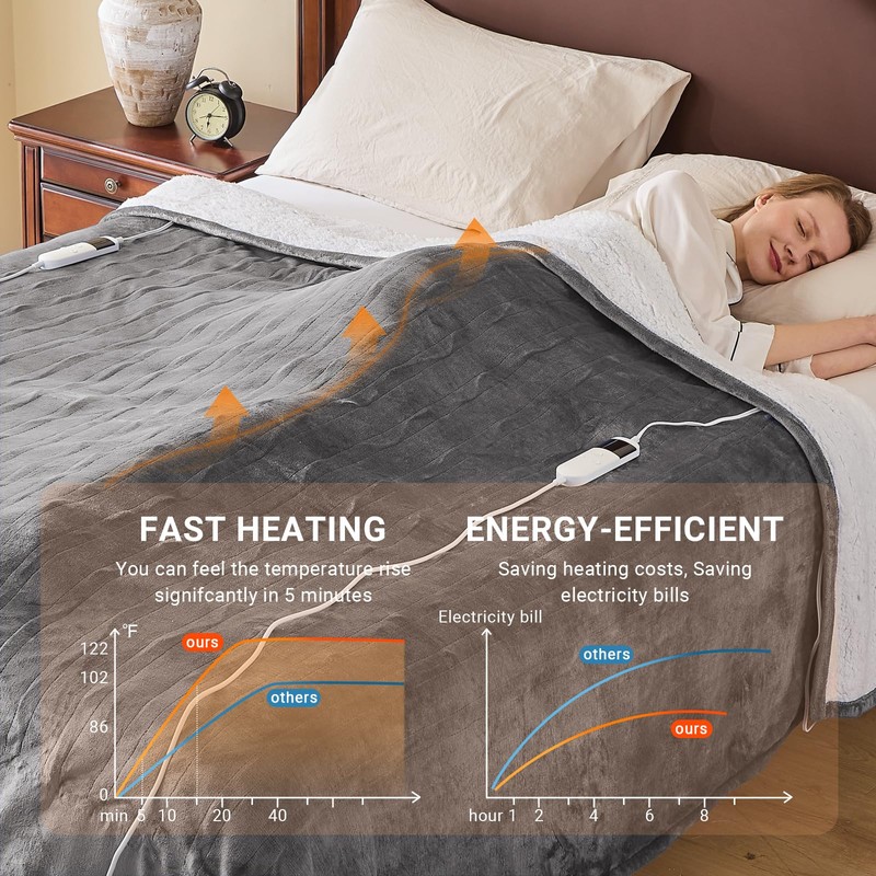 • Soft & Skin-Friendly: Made from plush flannel on one side and cozy sherpa on the other, this heated blanket offers luxurious softness and excellent insulation. It feels warm and inviting even without power—perfect for snuggling up on chilly days or winding down after a long day.