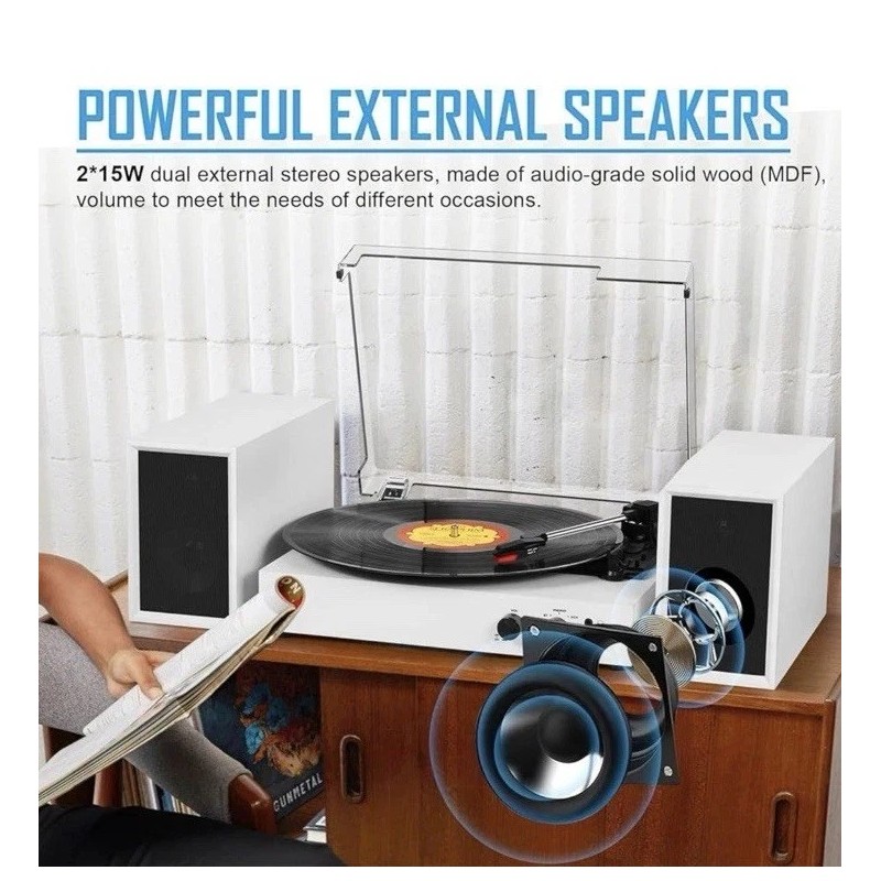 【Retro Vinyl Record Player】-- Record player with speakers is powerful enough to a fill a large room, it also features a vintage mid-century aesthetic, adding a touch of retro vibe to any room. Two bookshelf speakers not only works as capable music station but offers multiple placement options as turntable base or record shelf.