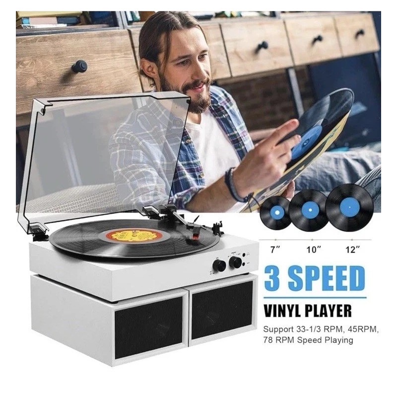 【3 Speeds Turntable with Speakers】Removable protective dust cover and auto-stop function supports all 7", 10"& 12" records with switchable 33⅓ 45, 78 RPM speed settings, it provides you with the flexibility to enjoy all kinds of vinyl records.