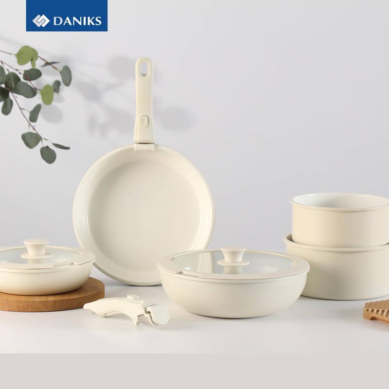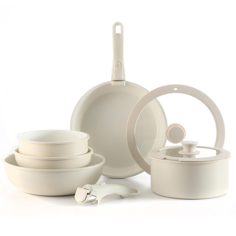 Daniks 9-Piece Nonstick Cookware Set, Ceramic Induction Pots and Pans with Detachable Silicone Handles, Oven & Dishwasher Safe, Beige