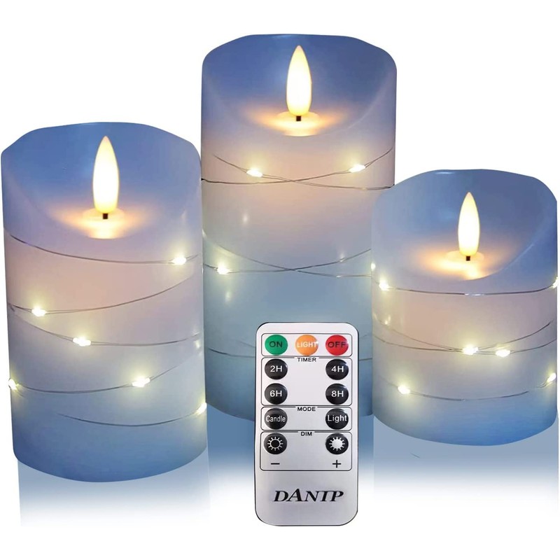 danip Sky Blue LED Flameless Candle, with Embedded Star String, 3-Piece Set of LED Candles, with 11 Button Remote Control, 24-Hour Timer Function, Dancing Flames, Real Wax, Battery Powered.