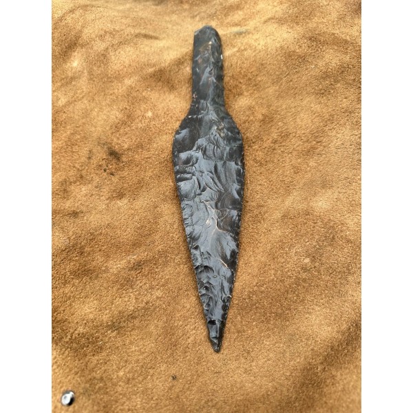This is a copy in Bronze of a type four danish dagger from the Neolithic time. It measures approximately 7 inches and is a rather large example.