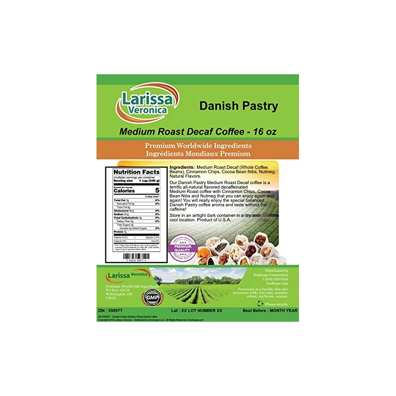 - Our Danish Pastry Medium Roast Decaf coffee is a terrific all-natural flavored decaffeinated Medium Roast coffee with Cinnamon Chips, Cocoa Bean Nibs and Nutmeg that you can enjoy again and again! You will really enjoy the special balanced Danish Pastry coffee aroma and taste without the caffeine! - Ingredients: Decaffeinated Medium Roast (whole coffee beans), Cinnamon Chips, Cocoa Bean Nibs, Nutmeg and Natural Danish Pastry Flavor.
