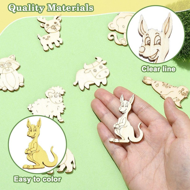 š¦ćQuantityćPackage comes with totally 100 pieces animal theme unfinished wooden cutouts in mixed style. Enough quantity and styles for your need.