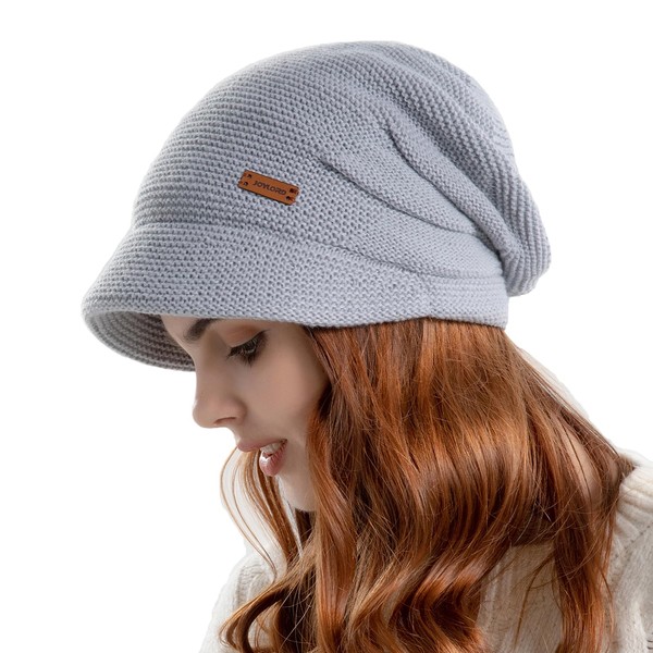 DANMY Womens Winter Beanie Hat,Fleece Lining Warm Knitted Slouchy Beanie Hats Cap with Visor Light Grey