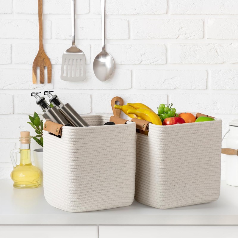 - Modern Charm: The storage baskets feature leather handles that provide comfortable grip for easy carrying. Woven baskets are made of 100% cotton to ensure long lasting use. The contrast between the cotton and leather creates a stylish and modern look