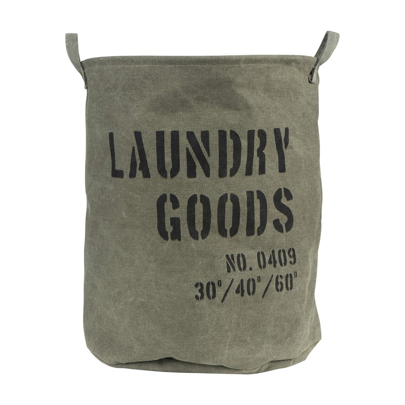 - GREAT IN ANY SPACE: The circular hoop top and pleasant army green color make this organizer basket the perfect addition to any room as a laundry or storage bin. It has 2 comfortable fabric handles that make it safe and easy to move around, even when it’s full of clothing or other items. Its stenciled letters say “Laundry Goods.”