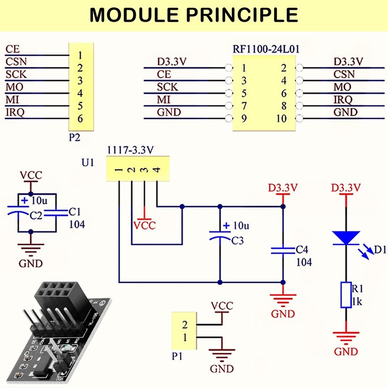 - Wireless module: Small power on SMD LED indicator; On-board 3.3V voltage regulator accepts your Development Board +5V supply and provides 3.3V for the attached "NRF24L01+" module.