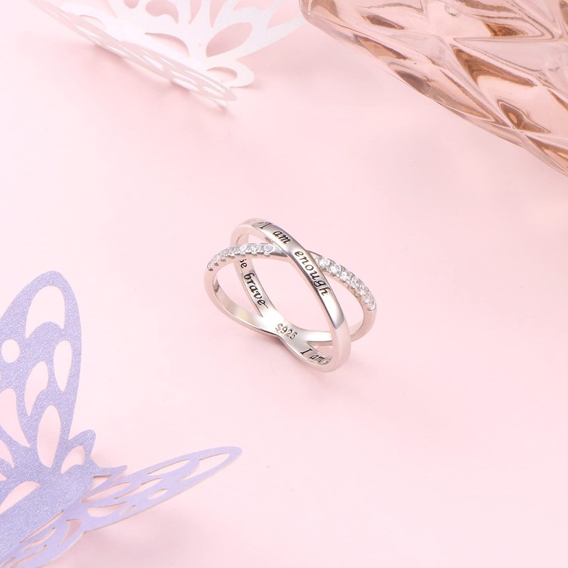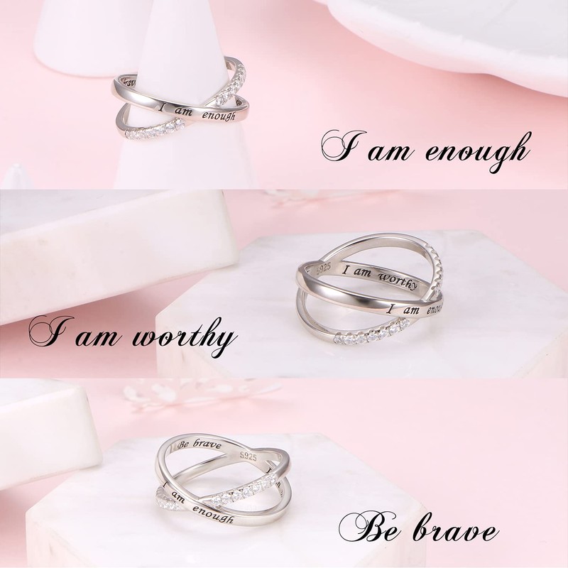 DAOSHANG 925 Sterling Silver Ring for Women I am Enough Inspirational Ring CZ Simulated Criss Cross X Ring Size 6, Sterling Silver, Zircon