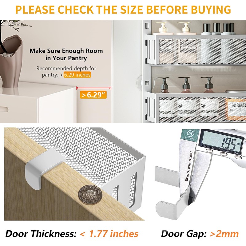 - Special Mesh Design: Our metal mesh door pantry organizer rack offers effortless organization. The open design provides a clear view of your items for easy access. The dense barbed wire on four sides prevents small items like seasoning bags and cosmetics from falling through. NOTE: Each basket can support up to 11 pounds.