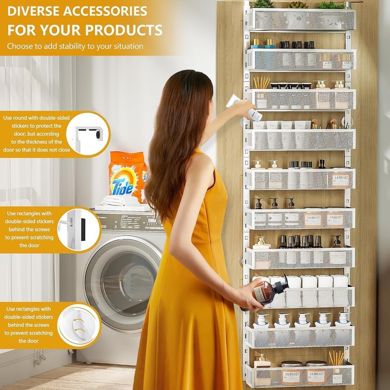 - Adjustable Design: Our pantry over the door organizer allows you to adjust the size of the storage shelf to accommodate items of different heights, making it perfect for a variety of storage needs.