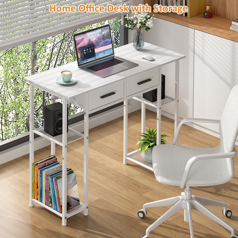 - 【Writing Desk with Storage Shelves】Our computer table feature 2-tier storage shelves on both sides, offering a unique design that not only provides ample storage space, but also enhances the stability of the desk. You can put books, bags, small speakers and even small storage baskets on the shelves.
