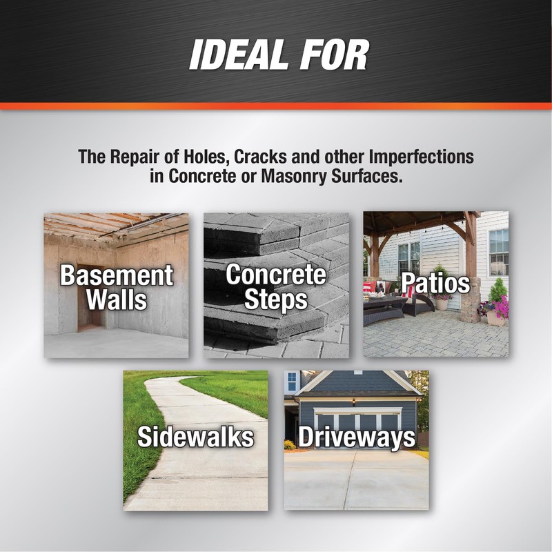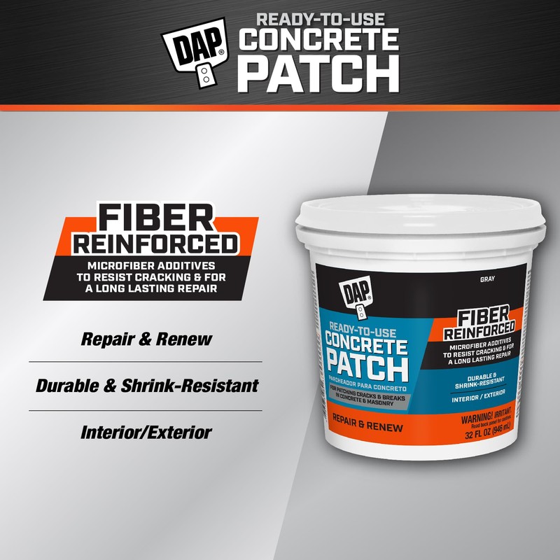 Product DescriptionDap 31084 Concrete Patch Interior and Exterior, 1-QuartFrom the ManufacturerUsed to patch small cracks and breaks, or spot level concrete and masonry surfaces such as basement walls, patios, steps, sidewalks and driveways. It dries to a durable, hard finish and is non-shrinking. Interior/exterior use.