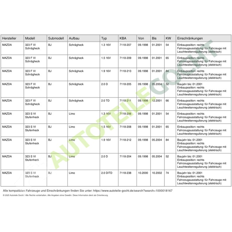 - Autoscheinwerfer, Frontscheinwerfer, Klappscheinwerfer, Hauptscheinwerfer: kompatibel mit MAZDA 323 F VI (BJ), kompatibel mit MAZDA FAMILIA VI (BJ)