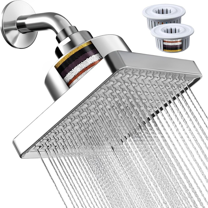 - 🚿CONTENIDO: 1 cabezal de ducha cuadrado de 6 pulgadas, 1 brazo de ducha redondo, 1 cartucho de filtro integrado, 1 cartucho de filtro de repuesto y 1 cinta de teflón. Nota: Se recomienda cambiar los cartuchos de filtro cada 3 a 6 meses.