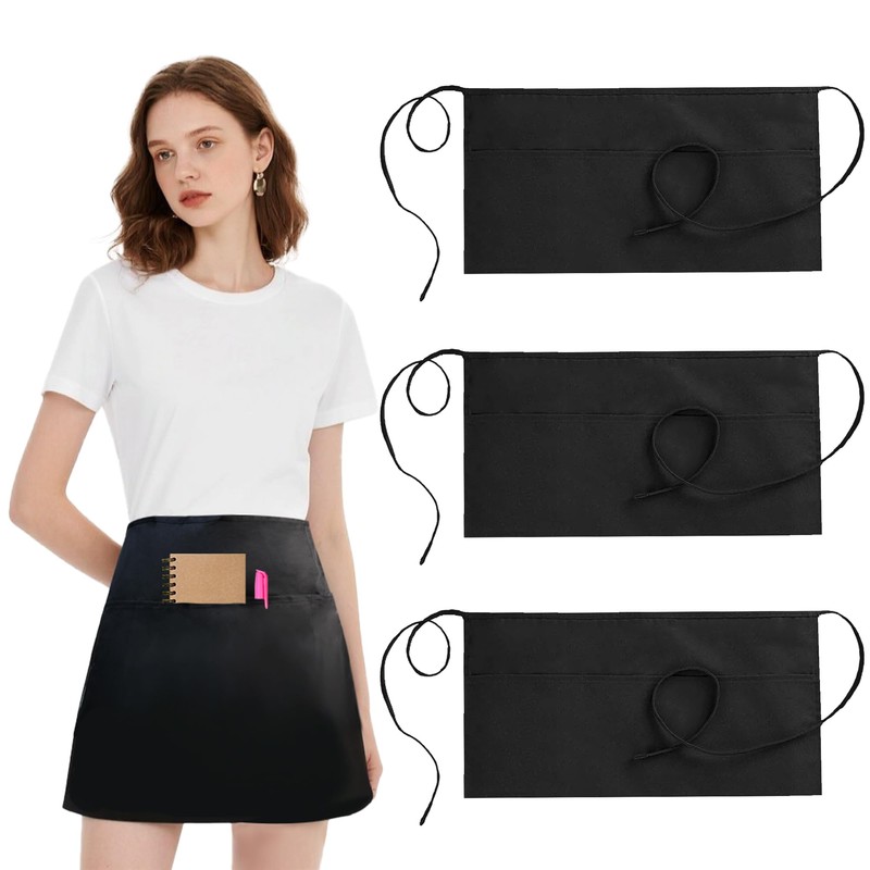 DAQUN 3 Pcs Waitress Apron, Waist Apron, Half Server Bistro Aprons Black Short Adjustable Tie Back with 3 Pockets for Women Men Chef Kitchen Restaurant