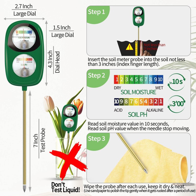 - 2-IN-1 SOIL TEST KIT: Soil PH Tester&Soil Moisture Meter helps gardeners make sensible decisions to optimal the plant‘s growth, increase effective watering rates, and no longer worry about overwatering. Enhance your gardening experience to the next level