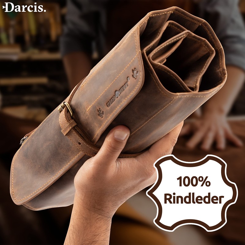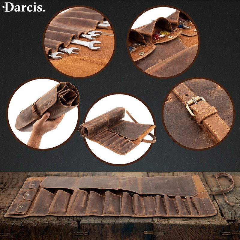 Darcis Tool Roll in Brown - Made of Genuine Cowhide Leather - Tool Roll Bag with 13 Compartments, 3 Button Pockets and a Zip Compartment - Tool Roll Motorcycle