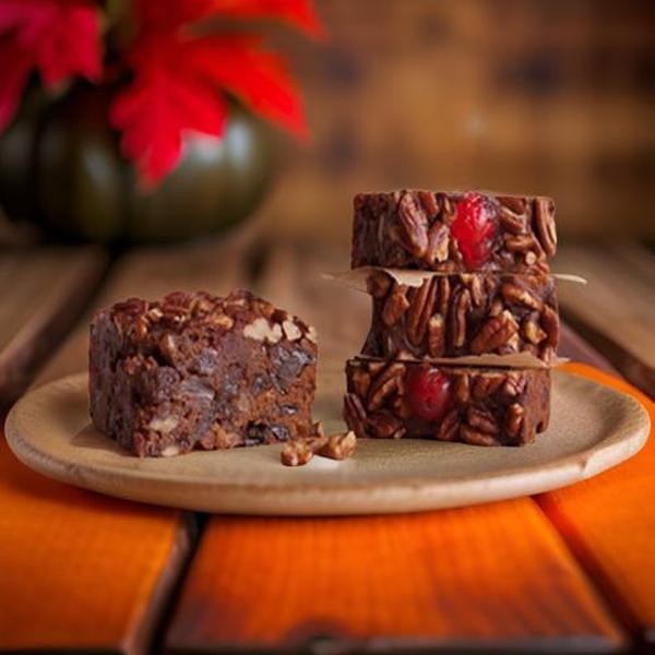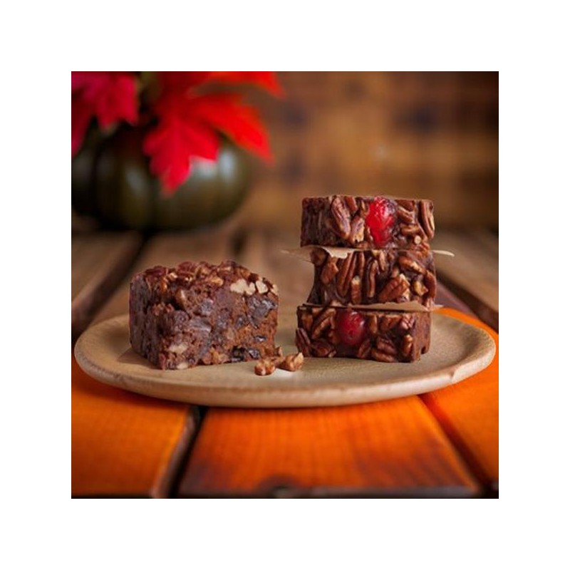 • Ingredients: aisins, glace red cherries (cherries, corn syrup, high fructose corn syrup, water, citric acid, natural and artificial flavor, potassium sorbate, and sodium benzoate [preservatives], red 40, sulphur dioxide [preservative]), glace pineapple (pineapple, corn syrup, high fructose corn syrup, water, citric acid, natural and artificial flavor, potassium sorbate and sodium benzoate [preservatives], oleoresin turmeric [color], sulphur dioxide [preservative]), flour (bleached wheat flour, malted barley flour, niacin, reduced iron, thiamine mononitrate, riboflavin, folic acid), eggs, palm shortening (palm oil, mono and diglycerides, polysorbate 60), pecans, sugar, orange peel (orange peel, glucose-fructose syrup, sugar, citric acid), water, brown sugar, canola oil, artificial flavor, glace (water, sugar, corn syrup, pectin, citric acid, potassium sorbate [preservative], artificial flavor, carrageenan, sodium phosphate, sodium metabisulfate [preservative], paprika, [color], salt, sodium propionate [preservative], preservative enzyme (maltodextrin, mineral oil, enzyme, potato starch).