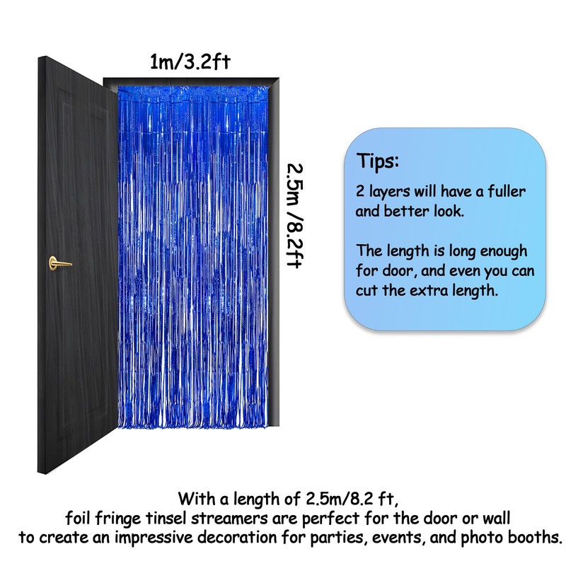 - GREATRIL Brand 8.2ft x 3.2ft dark blue foil fringe curtains 2-pack, this dark blue tinsel foil fringe curtains can make your party atmosphere fuller and more enjoyable.