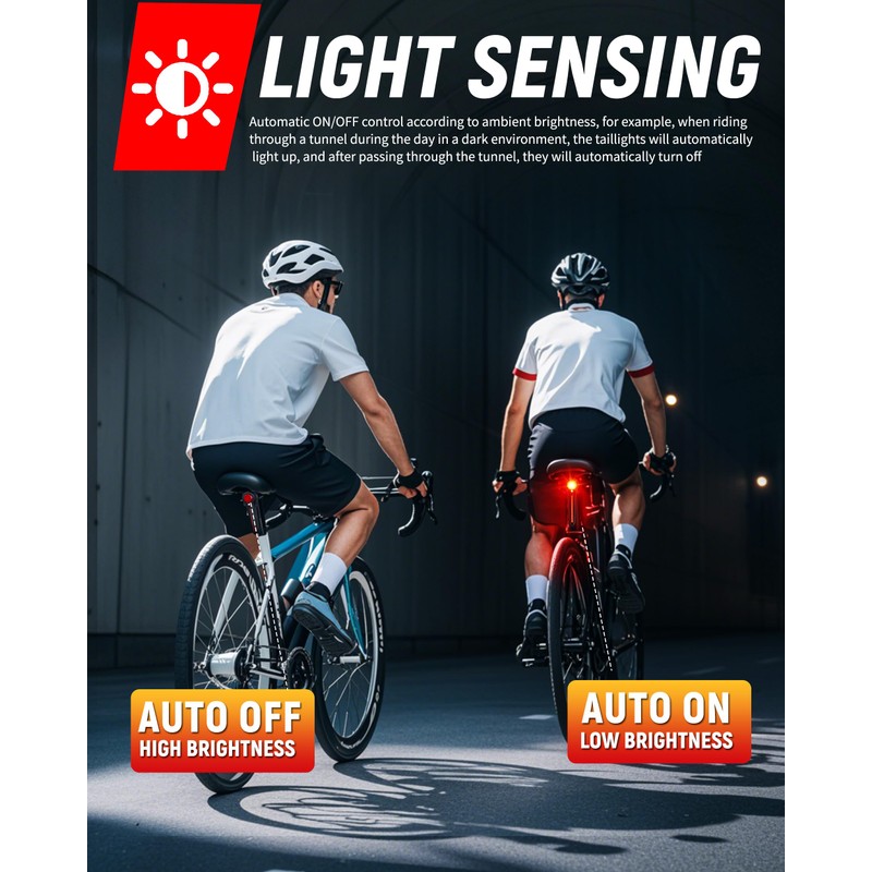 - INTELLIGENT BRAKING & LIGHT SENSING --- The normal mode defaults to turning on brake sensing at the same time. If rapid braking is detected, the mode will automatically switch and the brightness will be increased to alert the vehicles behind. Right click to activate the light sensing mode, put the bicycle tail lights into sleep mode in areas with sufficient brightness, and wake them up when entering a dark environment. You don't have to worry about wasting electricity