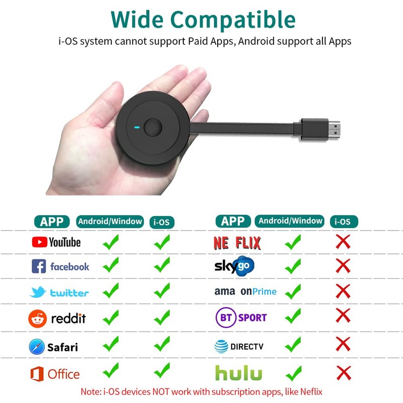 - 【Mirror Apps Limited for iOS Devices】Plug HDMI wireless dongle into your TV and cast most media you want from i-Phone, i-Pad, Ma,cbook, including movies, photos, music, Safari, Office apps, Youtube, Whatsapp, Skype, Twitter, Reddit, etc. Note: NOT Compatible with Neflix, Hulu plus, or other HDCP copyright apps
