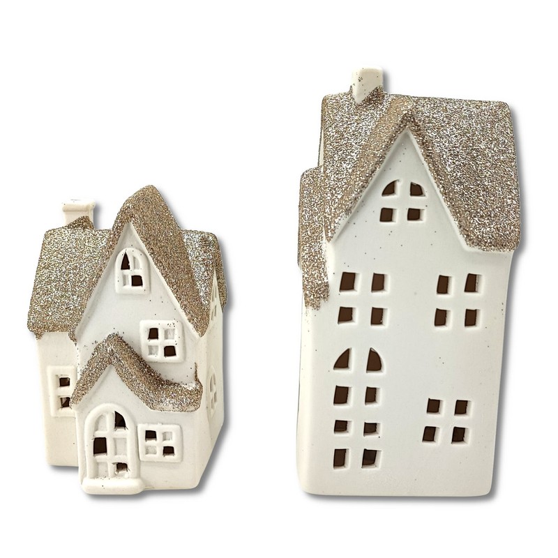 DARO DEKO Ceramic LED House Light House Gold Glitter Set of 2