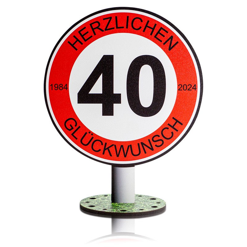 - Round sign made of wood in the design of a complete traffic sign with imitation of the metal pole and a round stand with grass decoration and 12 holes in diameter 5 mm for your own further decoration, e.g. for birthday candles or rolled banknotes, diameter of the circle with the year number: 20 cm - inscription: Herzlichen Glückwunsch und die aktuellen Jahrezahlen 1984 - 2024