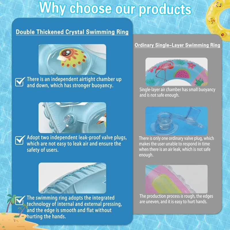 - 4. Easy to inflate: swimming hoop child double layer air nozzle design, the swimming ring can be easily filled with air. Good sealing performance keeps it inflated and reduces the possibility of air leakage, improving the safety of use.